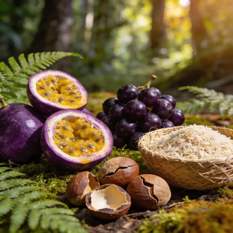 Un mélange d'huiles de fruit de la passion, açaï, babassu et son de riz. Nutrition profonde pour les peaux sèches.
